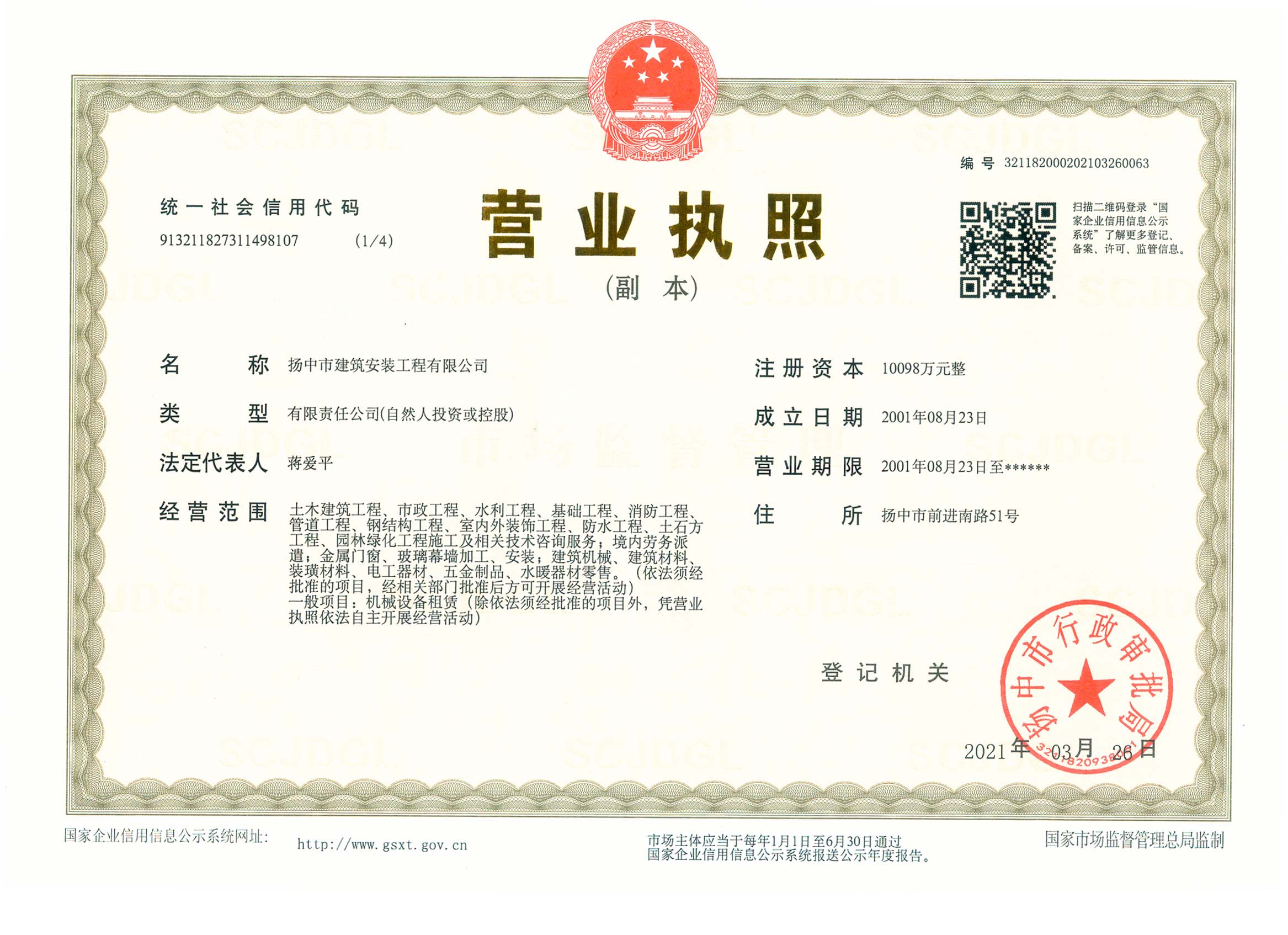揚(yáng)中市建筑安裝工程有限公司是房屋建筑工程施工總承包國(guó)家一級(jí)和市政公用工程施工總承包國(guó)家一級(jí)資質(zhì)施工企業(yè),并具有地基基礎(chǔ)工程專(zhuān)業(yè)承包、起重設(shè)備安裝工程專(zhuān)業(yè)承包、建筑裝修裝飾工程專(zhuān)業(yè)承包、消防設(shè)施工程專(zhuān)業(yè)承包、建筑機(jī)電安裝工程專(zhuān)業(yè)承包、鋼結(jié)構(gòu)工程專(zhuān)業(yè)承包等資質(zhì),在上海、南京、鎮(zhèn)江、蘇州、常州、沭陽(yáng)、蕪湖、湖北襄陽(yáng)等地設(shè)有分公司。60多年來(lái),公司承建了一大批工業(yè)與民用建筑,為地方經(jīng)濟(jì)和...
